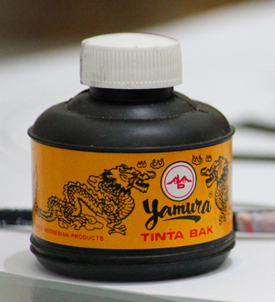 Disebut tinta cina, warnanya hitam pekat dan tidak luntur bila terkena air. Ada yang berbentuk cairan dan berbentuk balok balok kecil.